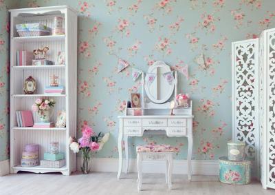 Обои в этом стиле вобрали в себя все черты стиля прованс, поэтому обои нужно выбирать белых и нежных тонов с элегантным рисунком всевозможных цветочных мотивов и луговых растений. Используется голубая, светло зеленая, лавандовая палитра, а также терракотовые и желтые оттенки.