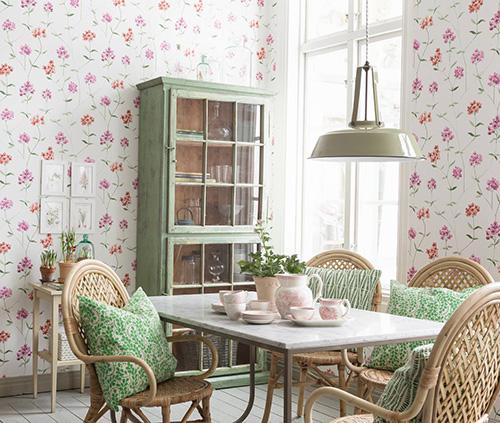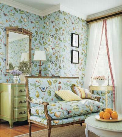 Обои в этом стиле вобрали в себя все черты стиля прованс, поэтому обои нужно выбирать белых и нежных тонов с элегантным рисунком всевозможных цветочных мотивов и луговых растений. Используется голубая, светло зеленая, лавандовая палитра, а также терракотовые и желтые оттенки.
